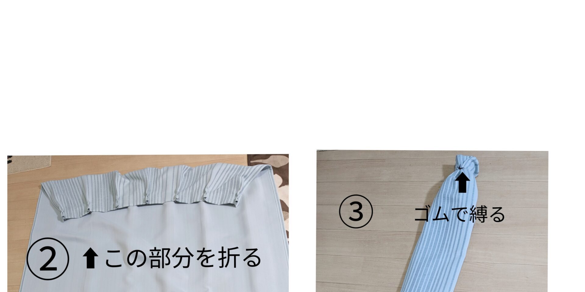 ②カーテンを床に広げたら、フックが付いたまま折ります(画像参照)